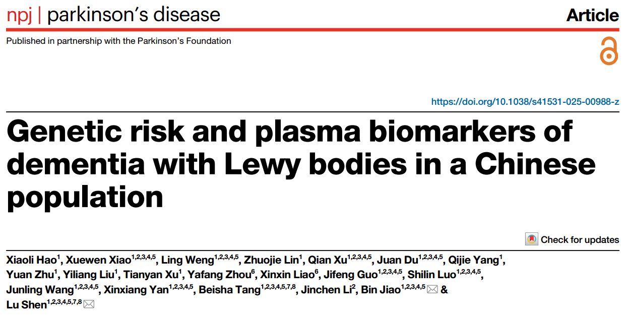 由中南大学湘雅医院神经内科沈璐教授和焦斌教授共同通讯在《NPJ Parkinsons Disease》(IF=6.7)上发表了对中国人群路易体痴呆(DLB)的遗传风险和血浆生物标志物的研究。