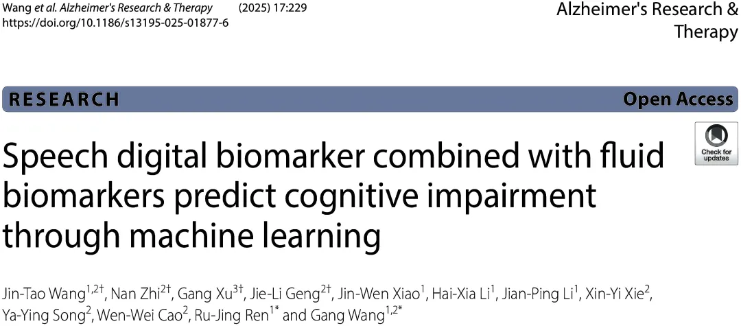 由王刚教授团队在《Alzheimers Research & Therapy》(IF=7.6)上发表语音数字生物标志物与血液生物标志物预测认知损伤与大脑病理变化的研究,并成功构建了高效、低成本的机器学习诊断模型。